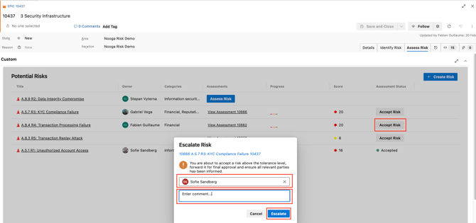 When accepting a risk, you have two alternatives: "Accept Risk", or "Accept and Escalate" depending if any further approval is required or not.
