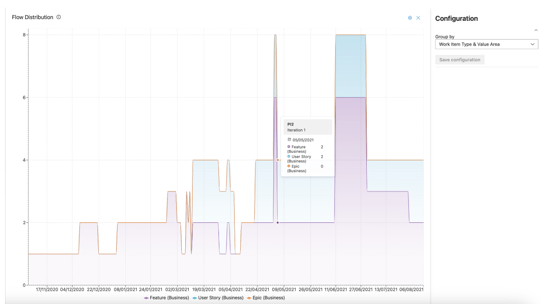 Flow distribution can be configured to separate data by Work items or Work items & Value Area. This means that if your organization uses example the work item Feature, but you separate these by Value Area, Example Architecture & Business, these can be separated to visually show this separation of work in the graph.
