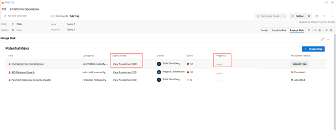 Step 1 - Open the risk assessment work item by clicking the "View Assessment x" or "progress" bar icons.