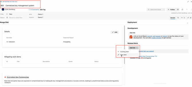 Step 3 - Tie any associated work items to the Risk Treatment by opening the Risk Treatment work item and "Add link" - "New item", add any item as related.