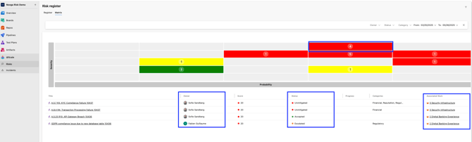 You can click on any square in the Matrix to view a detailed overview of all risk assessments associated with that specific risk score. The overview includes key details such as the Owner, Status, and the linked work item for each risk assessment.