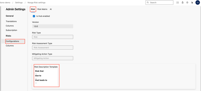 - Risk Configurations: these include 3 sections (listed below, see following paragraphs for further details):
