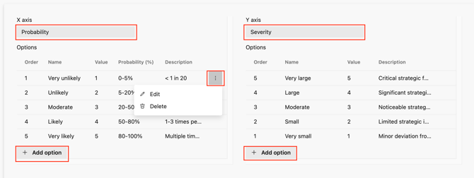 Click the "+Add option" to add additional categories or the tre dots in the specific row to edit the information.