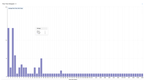 The histogram aggregates this data and groups work items by their flow time for easy visualization.